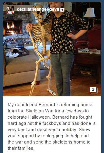The overwhelming popularity of the Skeleton War can be broken down into three factors. First of all, pretty much everyone on Tumblr is already in agreement that skeletons are awesome. Second, it’s entertaining to tell ridiculous stories about destroying fuckboys using a skeleton army. And third, the prevalence of plastic Halloween skeletons means that you can easily create your very own Skeleton War photo.