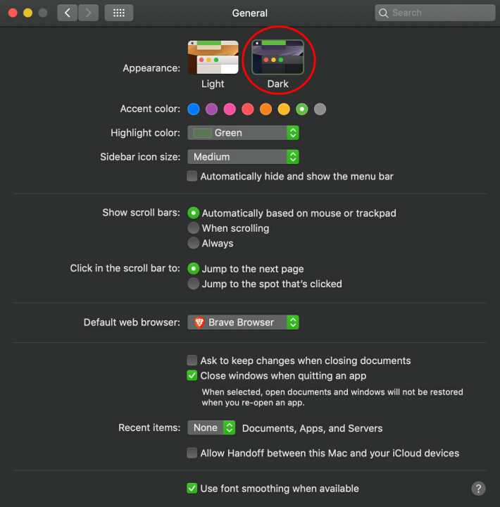 After selecting General, locate and click the Dark icon in the upper-right corner of the menu to enable dark mode. You should immediately notice the menu change to a dark color.