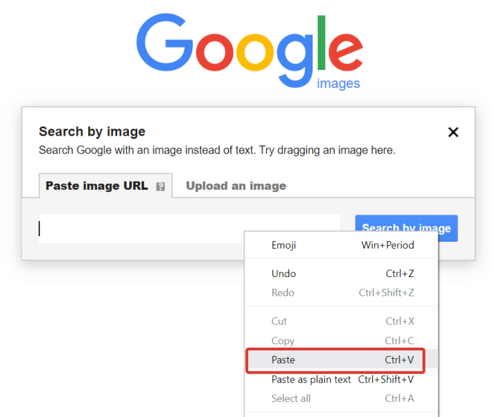 Go to Google Images and click Search by image. Choose the Paste image URL tab. Right-click on the text space and choose Paste.
