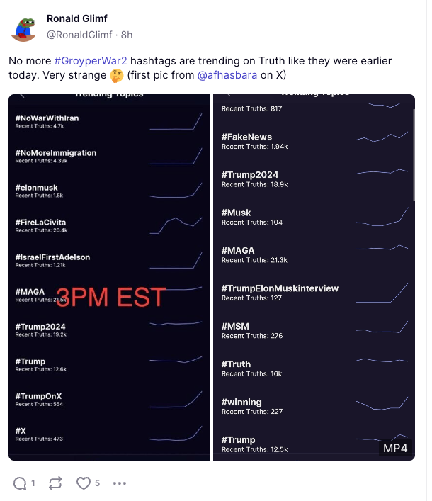 "Gm frens, as we saw from AF Hasabara last night truth had taken down ALL of our hashtags that rightfully belong on that trending page. So either we need to change up the hashtags or go even crazier and posting the hashtags every few seconds," wrote one soldier, waking up to see that their hard-won ground, the ephemeral trending topics sidebar, had been seized back by the enemy.