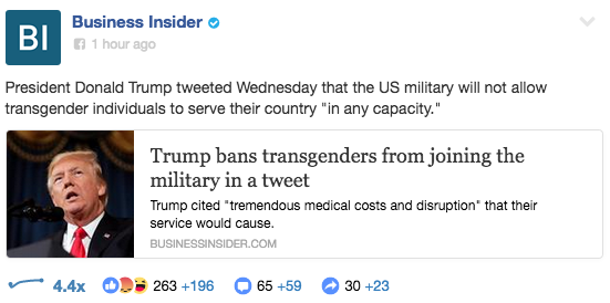 The president isn't the first person to do this. Shortly after Trump's tweets hit the news cycle, a slew of writers and public figures began using incorrect terminology to announce the news. Paste used the term "transgenders" in its headline. Military.com called trans people "transgendered," and so did well-meaning Sen. Tammy Duckworth in a pro-trans interview with Anderson Cooper. Business Insider announced the news with a Facebook headline that read, "Trump bans transgenders from joining the military in a tweet."