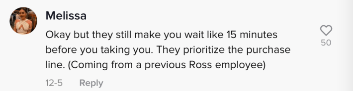 "Okay but they still make you wait like 15 minutes before taking you," they wrote. "They prioritize the purchase line. (Coming from a previous Ross employee."
