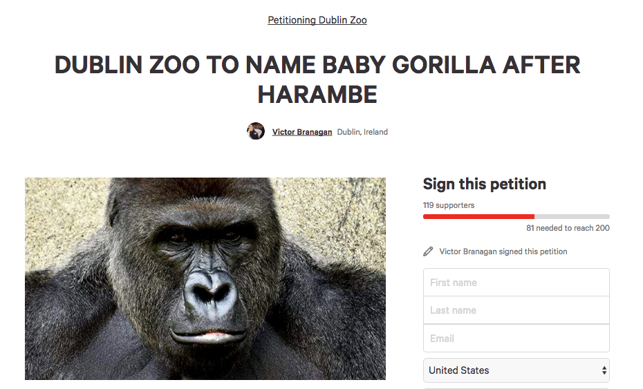Branagan wrote in the petition description, "Dublin zoo have recently gained an additional member to their gorilla squad. At the time of writing this the baby is nameless and its gender hasn't been confirmed by its keepers."