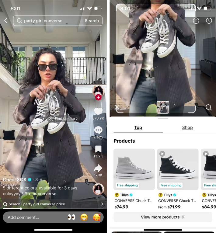 As for how well it works, here are a few examples of what TikTok's AI brings up. First, a pair of Converse Chuck Taylor All Stars that Charli XCX is holding—but not her special edition style.