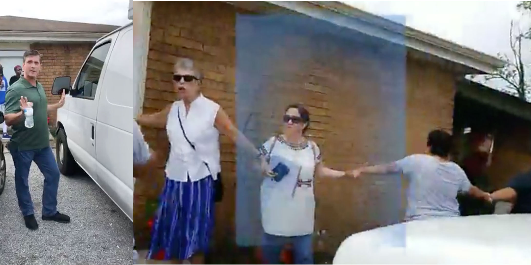 Left: An ICE agent is being interrogated by one of the neighbors; Right: four neighbors seen in a human chain outside the doorway of the victims, helping them escape from their car into the home. The video on the right was tinted with a filter as well as an audio filter by Facebook, according to the person who shot it.