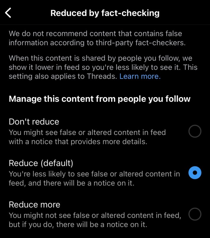 The Daily Dot also found that Meta isn't allowing users to stray from Instagram's default setting for how much content on one's feed to reduce by fact-checking. In the app's "content preferences" settings menu, users are given three options for how much fact-checked content appears in their feed: reduce content via fact-checking (meaning less false or altered content), reduce more (hardly any false or altered content), or don't reduce at all (false and altered content in feed potentially without a warning).