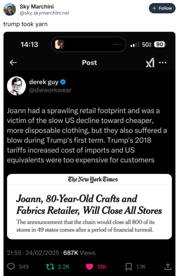 Joann Fabrics has announced the closure of all its remaining U.S. stores by May 2025, and people are posting reactions to the news online. The fabric store has been a cornerstone in the crafting community for over 80 years and is sometimes the only fabric store in town.