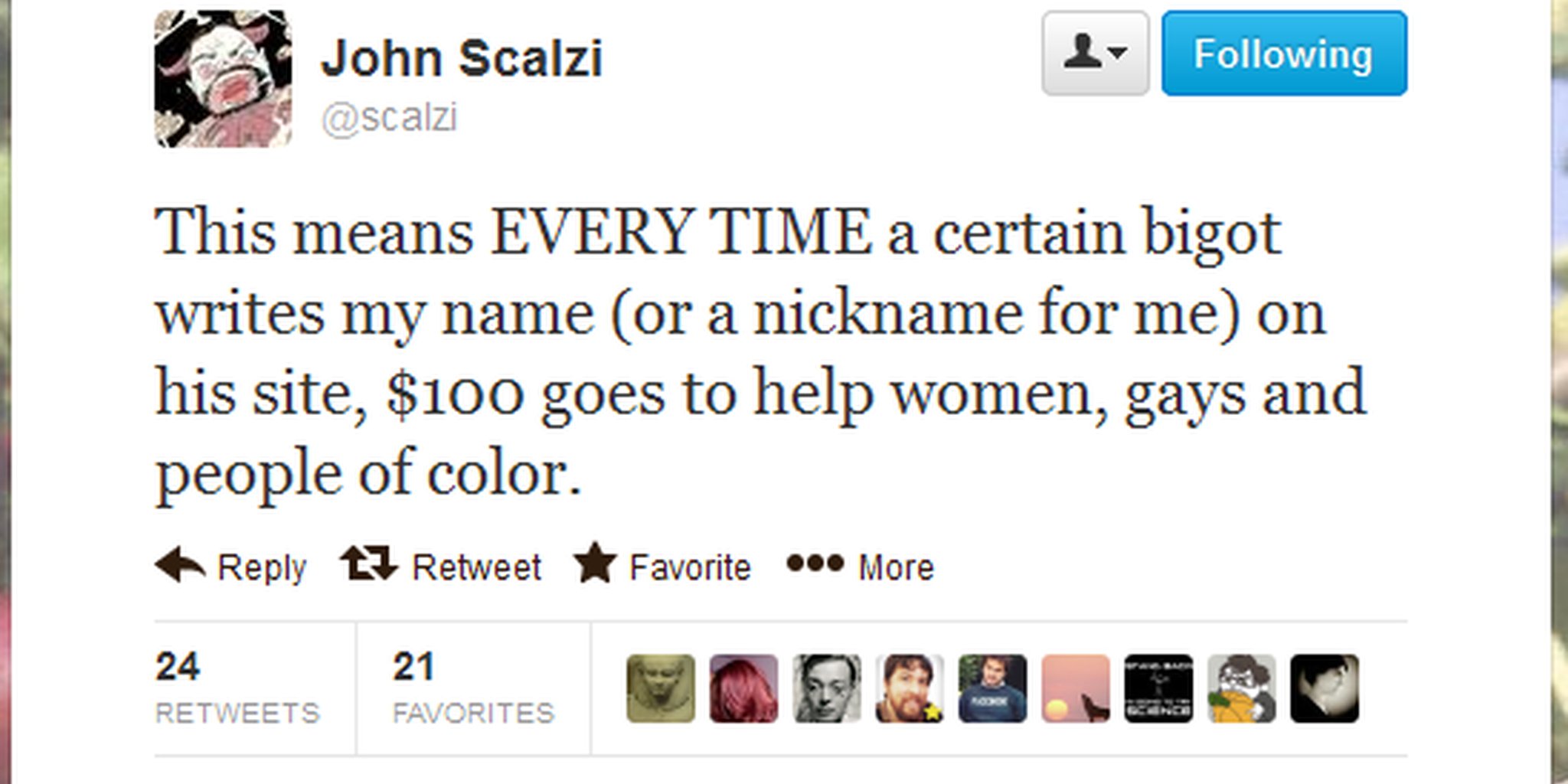 In a post titled "Solving my racist sexist homophobic dipshit problem," Scalzi writes: