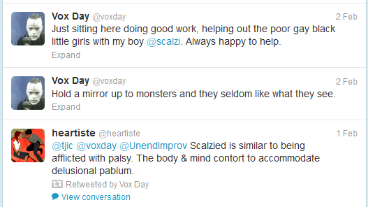 When Scalzi mentions “adorable nicknames” in his Counteract a Bigot post, he’s referring to Vox Day’s love of calling him names like McRapey, as evidenced by his most recent post. This post challenges Scalzi to a political debate in response to the charity donation drive, although Vox Day concludes that Scalzi will never accept, saying: