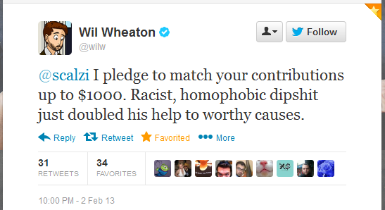 Scalzi goes on to say that the money will be donated to a selection of human rights organizations, but that he will need help from readers to keep a tally of Vox Day’s blog. Soon enough, fans were lending their support, offering to donate alongside Scalzi. Only two days later, the Counteract a Bigot Drive is up to over $50,000 in total.