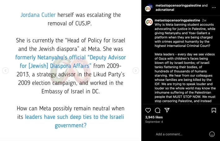 "Jordana Cutler herself was escalating removal of CUSJP," the statement reads. "How can Meta remain neutral when its leaders have such deep ties to the Israeli government?"