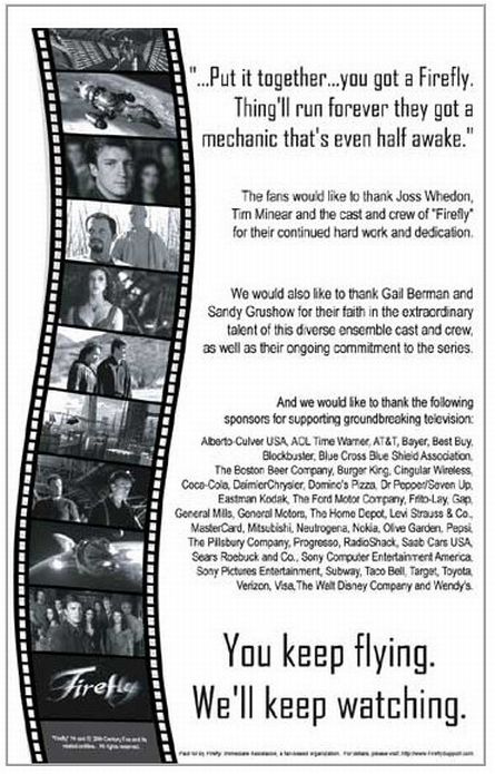 Variety ad from Firefly fans to support the show before cancellation, image via the_chulk/Flickr
