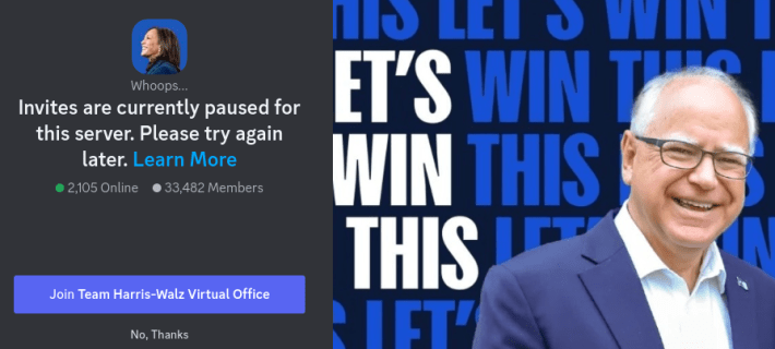 Anyone attempting to join the server, titled "Team Harris Walz Virtual Office." on Wednesday was met with a message indicating that it had been closed to new members.