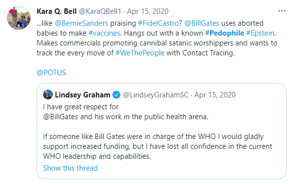 Last April, she tweeted conspiracy theories about Bill Gates using aborted tissue to make vaccines, hanging out with Jeffrey Epstein, and making "commercials promoting cannibal satanic worshippers." QAnon followers have a fixation on Gates. Bell stands by her opinion of one of the world's most philanthropic people.