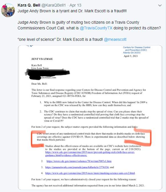 Before locking her account, Bell repeatedly tweeted a letter she received from the CDC in response to her inquiry about data proving masks work. The letter states that there haven't been any randomized control trials on the efficacy of masks at suppressing the spread of COVID-19 and includes links to data demonstrating that masks block particles