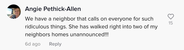 "We have a neighbor that calls on everyone for such ridiculous things," one commenter wrote. "She has walked right into two of my neighbors homes unannounced!!!"