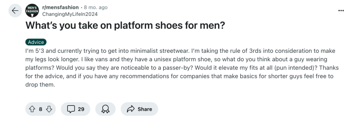 In December 2023, people discussed platform sneakers and other shoes on the men’s fashion subreddit.