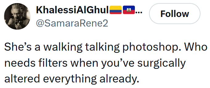 "She’s a walking talking photoshop," said @SamaraRene2. "Who needs filters when you’ve surgically altered everything already."