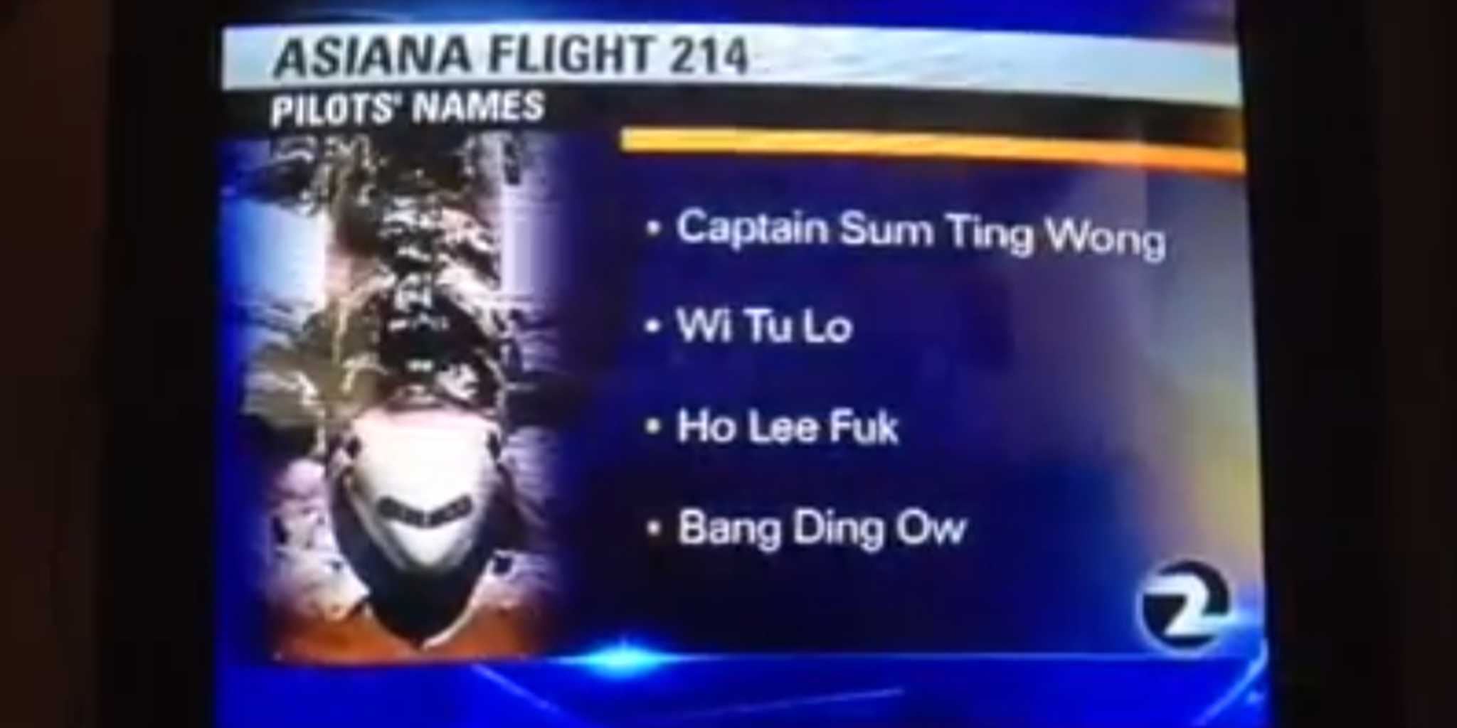 During the noon broadcast, KTVU claimed that the pilots in charge of the Boeing 777 were Captain Sum Ting Wong (something wrong), Wi Tu Lo (we too low), Ho Lee Fuk (holy fuck), and Bang Ding Ow (bang ding ow). Anchor Tori Campbell read these out loud, apparently not aware that it was a racist joke that somehow made it on air. Inevitably, the gaffe landed on YouTube.