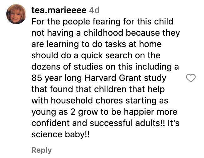 "For the people fearing for this child not having a childhood because they are learning to do tasks at home should do a quick search on the dozens of studies on this," read a response. "It's science, baby!"