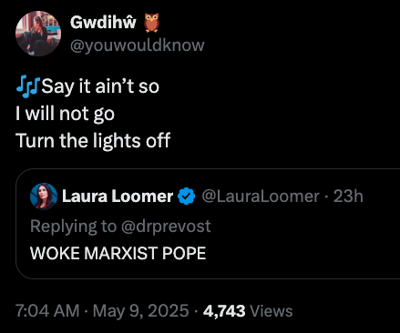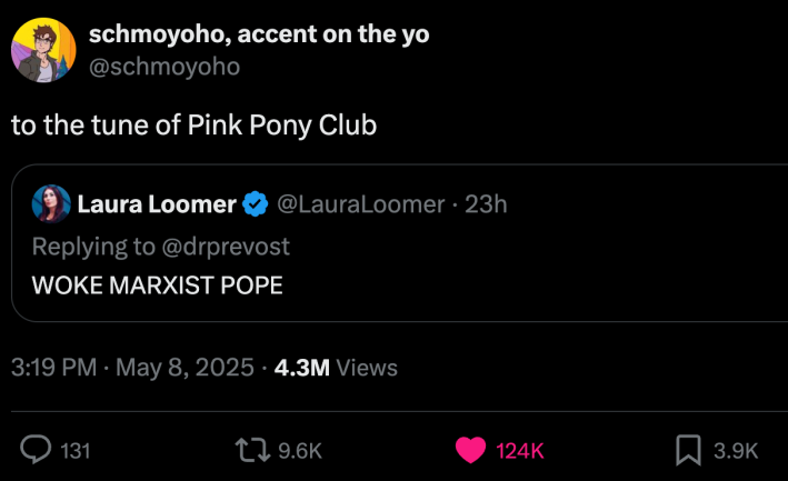 So it came as no shock that some of the more active right-wing personalities began to complain. It came as even less of a shock that Loomer's "WOKE MARXIST POPE" tweet started becoming a phrasal template, "to the tune of" meme. It does have a nice cadence to it. Would be kind of a sick band name? Y'all can have that one for free.