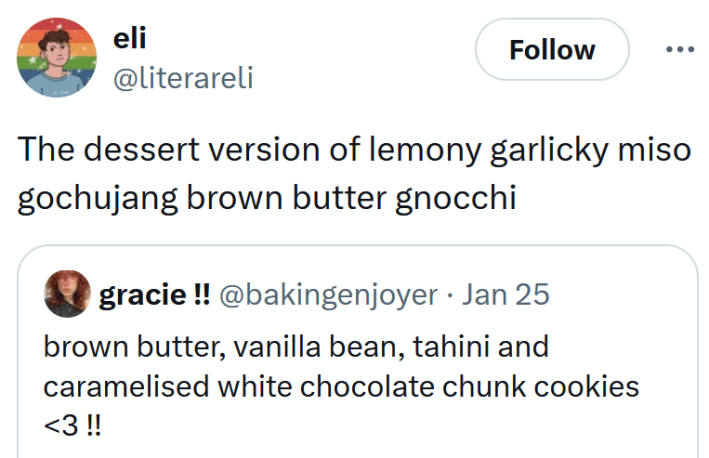 Tweet reading "when we gather together for lunar new year, we serve our past ancestors lemony garlicky miso gochujang brown butter gnocchi as is tradition"