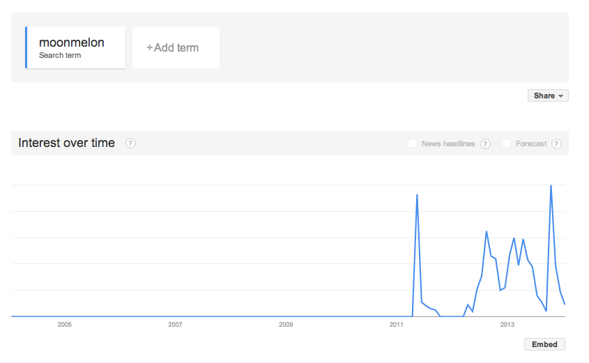 Moonmelon has made suckers out of the Internet since May 2011, when the phrase went from 0 mentions to nearly 100. While Pinterest has been a safe, welcoming, viral home for the Moonmelon, Tumblr is just as responsible for all this nonsense.