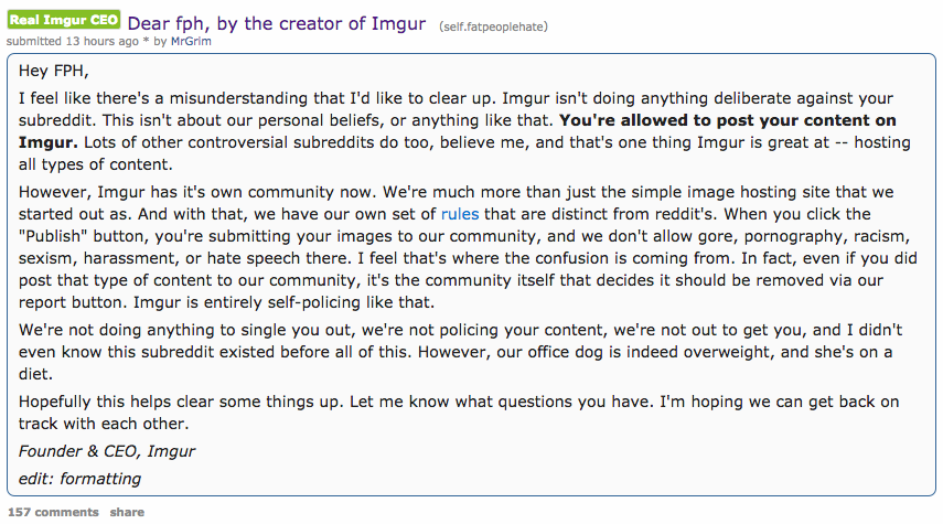 Accused of censoring pictures linked to by r/fatpeoplehate—it's exactly what it sounds like—Imgur founder and CEO Alan Schaaf denied the charges.