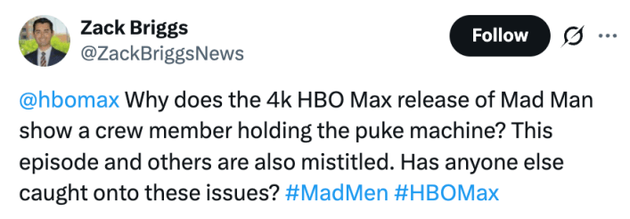 "Why does the 4k HBO Max release of Mad [Men] show a crew member holding the puke machine? This episode and others are also mistitled. Has anyone else caught onto these issues?" an X poster asks.