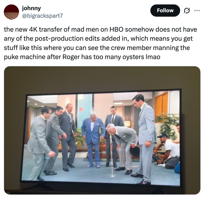 "The new 4K transfer of Mad Men on HBO somehow does not have any of the post-production edits added in, which means you get stuff like this where you can see the crew member manning the puke machine after Roger has too many oysters lmao," one X post writes.