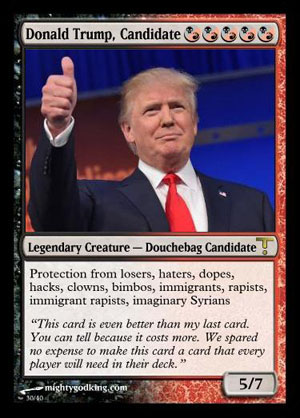 Sometimes American politics feel like a silly game for attention, with candidates saying outrageous things, bluffing, or just flat out lying to up their poll numbers. To help illustrate the ridiculousness of today's electoral landscape, one man has turned many of the 2016 presidential hopefuls and their worst ideas into Magic: The Gathering trading cards.
