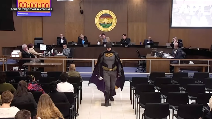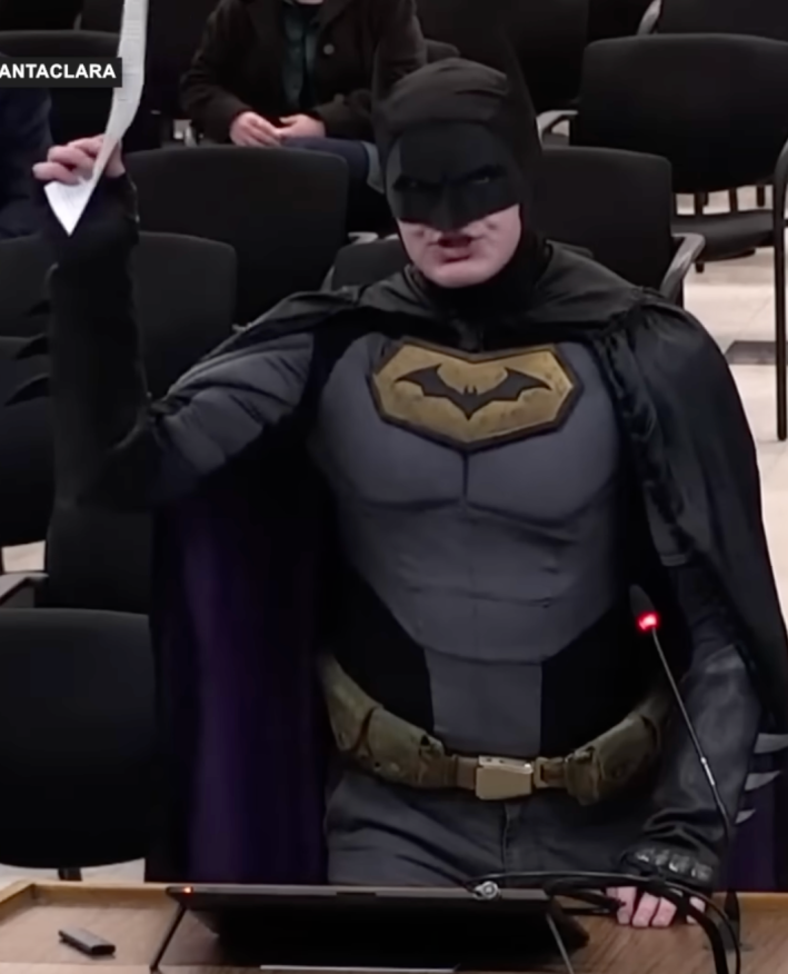 The man dressed as Batman approached the podium and confronted Santa Clara council members responsible for ensuring community safety during the upcoming Super Bowl on Feb. 8, 2026.