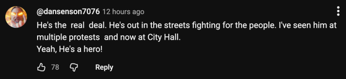 “He's the real deal. He's out in the streets fighting for the people,” agreed @dansenson7076. “I've seen him at multiple protests and now at City Hall. Yeah, he's a hero!”