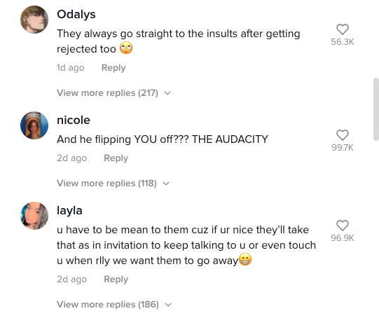 Her initial video has been liked 3.3 million times and viewed nearly 14 million times since being posted on Thursday. The video was sadly all too relatable for many women. “Why do they think we want to talk to them so bad? If i don’t know you i don’t care to have a conversation w/ you,” one viewer questioned.