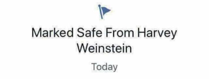 On October 14, 2017, the Facebook page Liberty with Paul Marie posted an altered version of the Safety Check image reading “marked safe from Harvey Weinstein today." This referenced the extensive allegations of sexual abuse, assault, rape, and harassment perpetrated by the film producer upon women in the industry over decades.