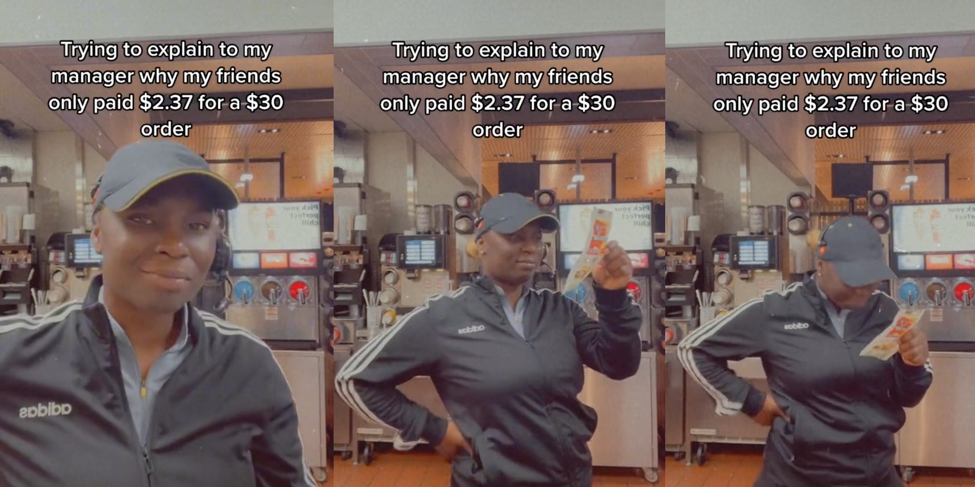 "Trying to explain to my manager why my friends only paid $2.37 for a $30 order," Chanel said in the video.