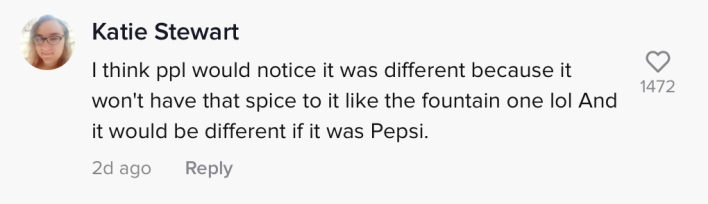 "I think (people) would notice it was different because it won't have that spice to it like the fountain one lol," one commenter wrote. "It would be different if it was Pepsi."