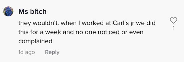 "They wouldn't," the commenter wrote. "When I worked at Carl's Jr. we did this for a week and no one noticed or even complained."