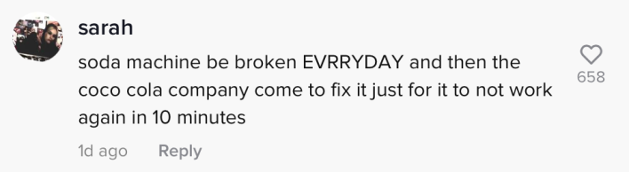 The video features two employees using the bottled sodas instead of the soda fountain because it is not functional, a situation that is all too common in the fast-food industry, according to the comment section. Many commenters shared their own experiences of having to hand out cans of soda or be asked to run to the store to grab a few liters of various beverages to meet the needs of customers when the machine needs to be serviced.