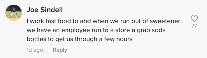 "I work fast food (too) and when we run out of sweetener we have an employee run to a store (and) grab soda bottled to get us through a few hours," one commenter wrote.