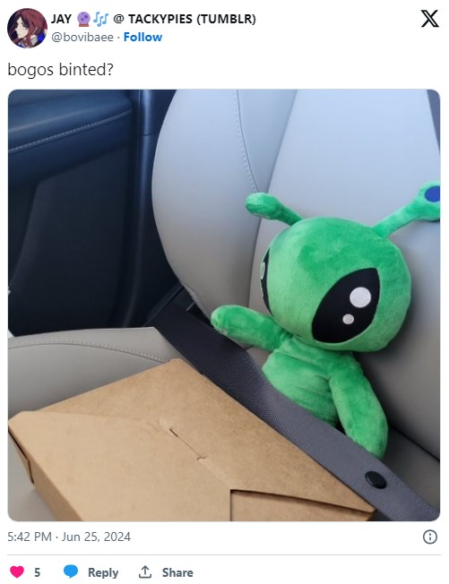 The phrase also became a title achievement in a Roblox game. With aliens having such a moment, so too are alien transformations, with bogos binted.