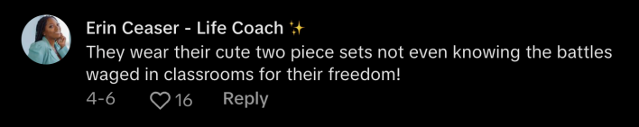 “We DID win the war,” said @patrickjimmy.andjohn. “They wear their cute two piece sets not even knowing the battles waged in classrooms for their freedom!” said @erinceaser.
