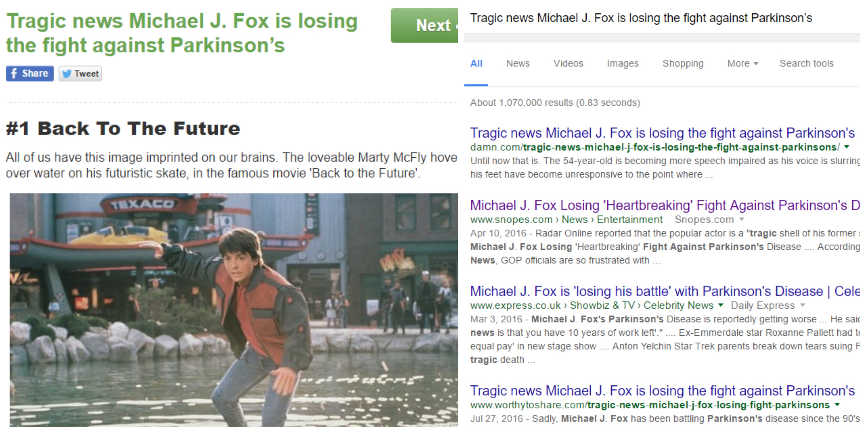 To see what this was all about, I signed up to be a publisher with MyLikes. I was first asked to create my own website, which I could do by choosing a template and a domain name. (Custom domains are available for a fee.) Then I was given a choice of content to share on my site. The first suggested story was about Michael J. Fox losing his battle to Parkinson's. I added the story and clicked the link, and I was shown one sentence and an image of the actor in the movie Back to the Future.