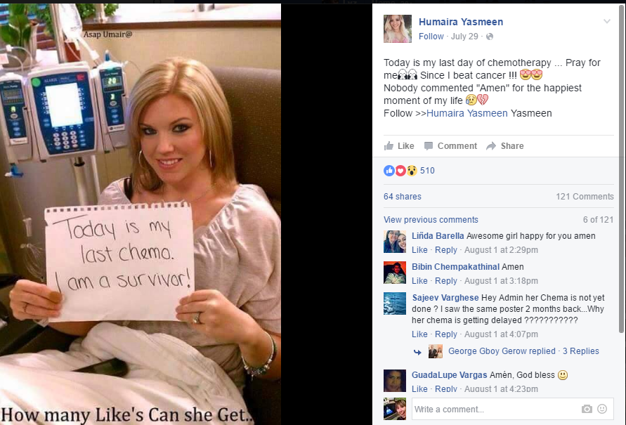Take, for example, this post of Sonja Darrell, a colon cancer survivor. Except Darrell didn't post it. Humaria Yasmeen did to increase activity on her personal profile.