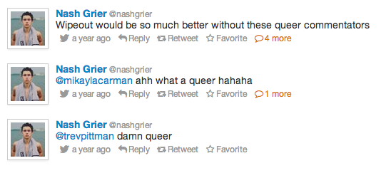 To get a larger scope of this bad place, Brandon Joseph of Poison Paradise compiled a list of every time Grier used the word “fag” or “gay” on Twitter. He conducted the search on Topsy, and you can do the same. You can also search Google for similar results. Grier may have moved on, but the tweets are still there.