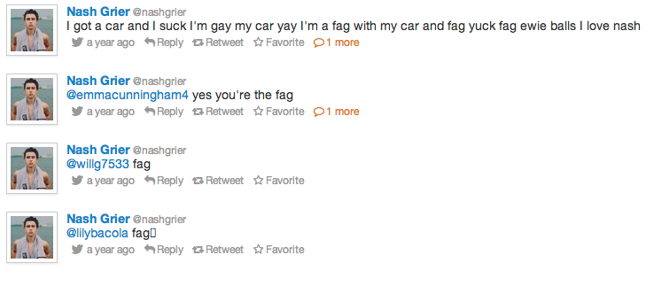 Earlier this week, a now-deleted Vine of 16-year-old Nash Grier screaming the word “fag” was called out by YouTuber Tyler Oakley. Grier, a Vine star with 8.7 million followers and a movie deal, apologized, saying he was “young, ignorant, stupid, and in a bad place.” He said he’s moved on and learned from his mistakes.