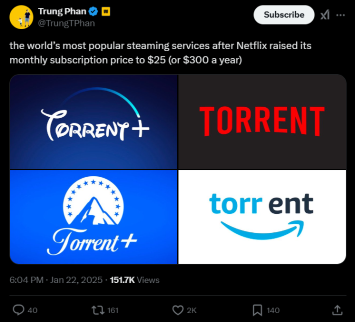 AI business builder @TrungTPhan subtly/not so subtly suggested his followers on X go for pirating services in lieu of Netflix, with a screenshot of several mainstream media services whose logos have been manipulated with the word “torrent.”