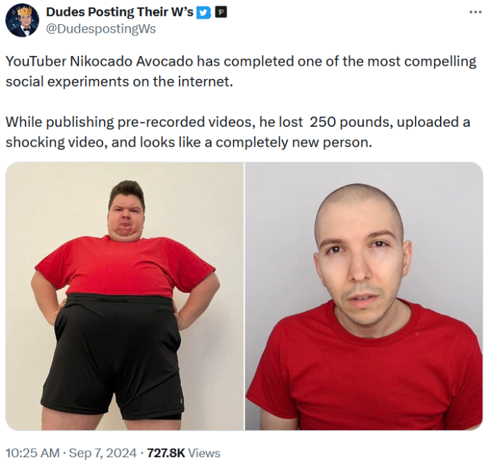 Plenty of folks are also making jokes about having "no excuse" for not losing weight now that Nikacado Avocado has transformed so drastically, but keep in mind that there is no moral imperative to be thin. Differences in hormones, metabolism, and environmental factors make changing one's weight more difficult for many people.