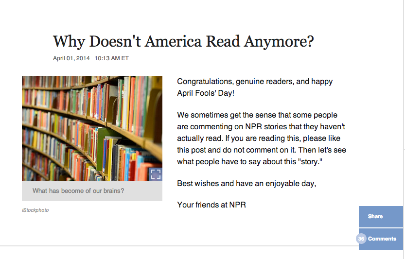 Earlier this week, NPR conducted a brilliant version of that test for April Fools’ Day. Except instead of trying to trip up third-graders with ADD, the joke was on their online readers who comment on articles without reading the story itself.