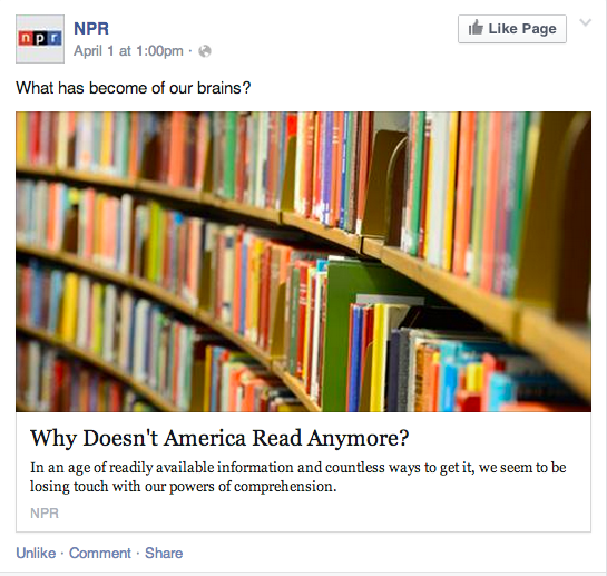 Basically, here’s what went down: Last Monday, NPR posted a link to a story on their Facebook page to a story with the headline, “Why Doesn’t America Read Anymore?”